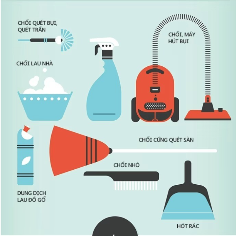 Nhân viên của chúng tôi sẽ mang đến nhà bạn tất cả các dụng cụ cần thiết cho công việc vệ sinh, bao gồm: máy hút bụi, chổi, ky hốt rác, cây lau nhà, xô, khăn lông, nước lau sàn, chất tẩy bồn cầu Vim, nước lau kính, bàn chải toilet, …. Nếu bạn có những yêu cầu đặc biệt về dụng cụ như bàn ủi, vui lòng ghi chú trong yêu cầu dịch vụ của bạn, nhân viên của chúng tôi sẽ cố gắng đáp ứng theo khả năng.